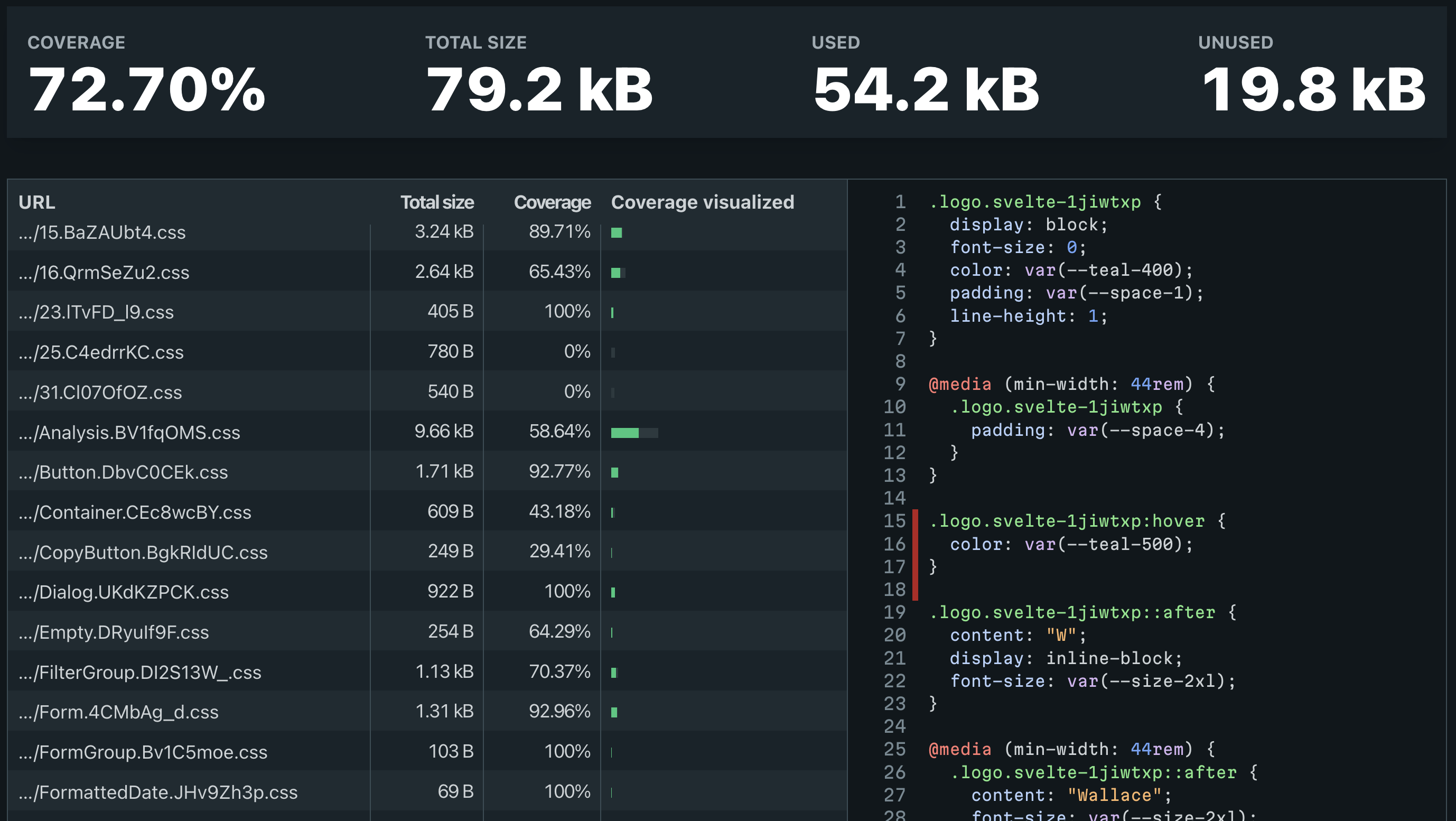 A webpage showing CSS Coverage report.