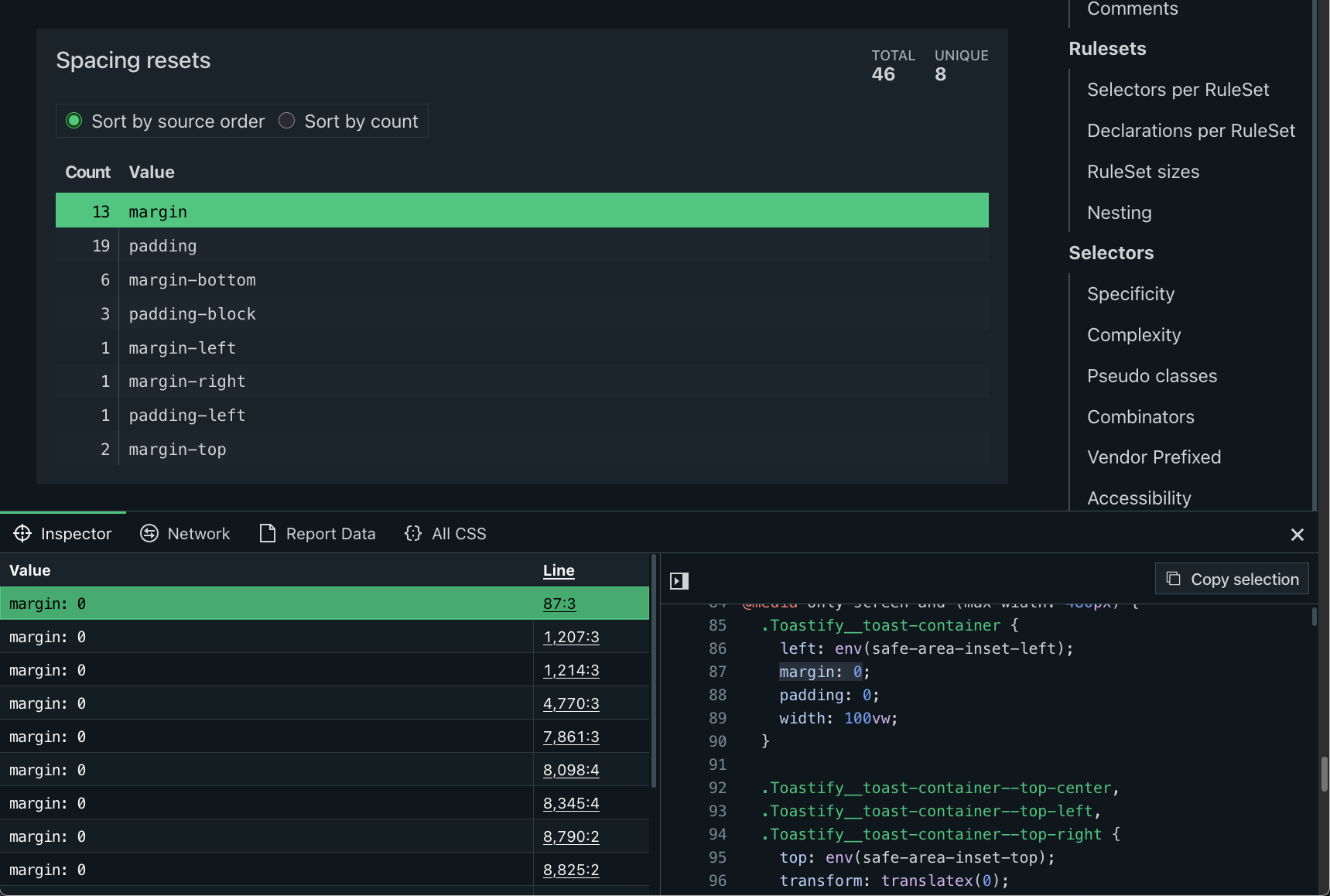 Initially sparked by the Web Almanac CSS chapter, this has been on my wish list for years and I finally got to it. It wasn’t even that hard to be honest so I’m a little disappointed in myself for not implementing this sooner. @projectwallace/css-analyzer@7.4.0 has all the details and the website now shows how deep you’re willing to go with your CSS.